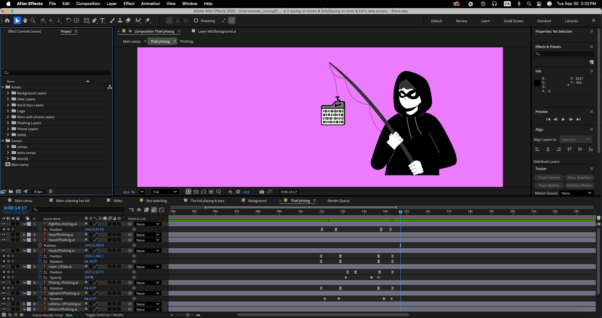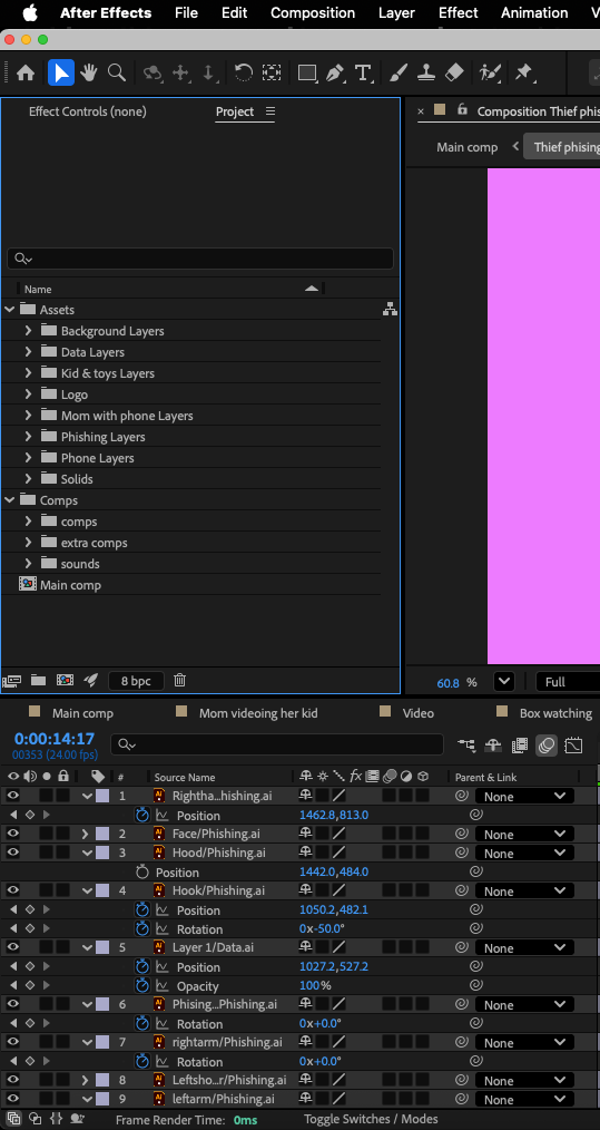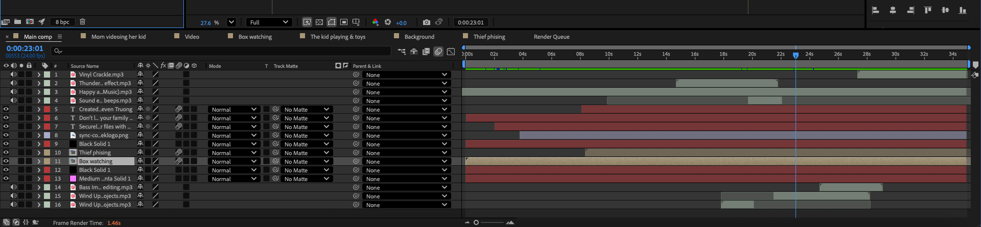Layered Compositions: Different comps (Kid & Toys, Mom Videoing, Thief Phishing) were nested into the main composition for an organized workflow.